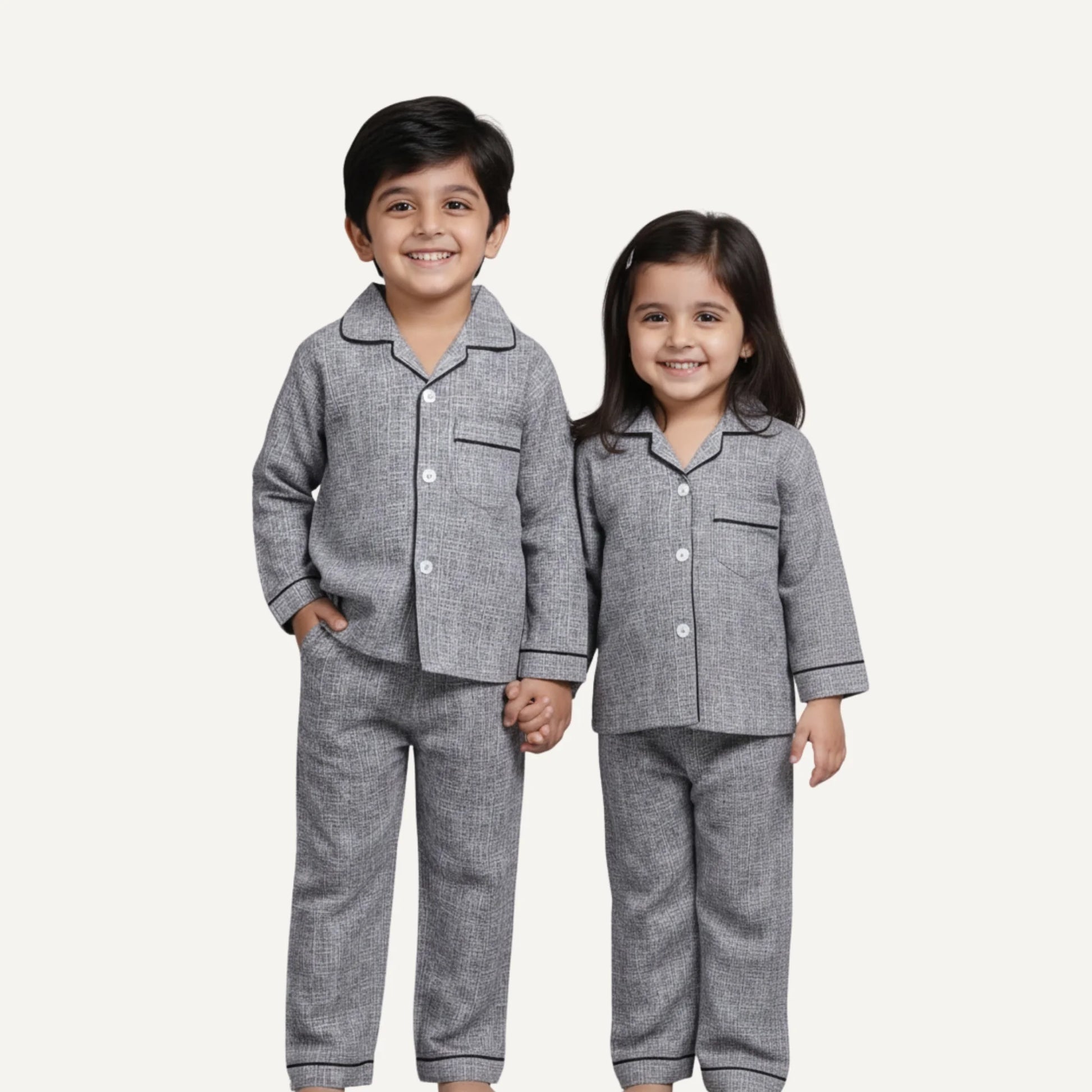 Keep your little one cozy and comfortable all night with this soft cotton night suit for kids aged 2 to 7 years. Designed with breathable fabric and a relaxed fit, this two-piece pajama set includes a button-down top with a front pocket and elastic waist pants, making it perfect for everyday sleepwear. The stylish grey pattern with black piping adds a smart look that both boys and girls will love.