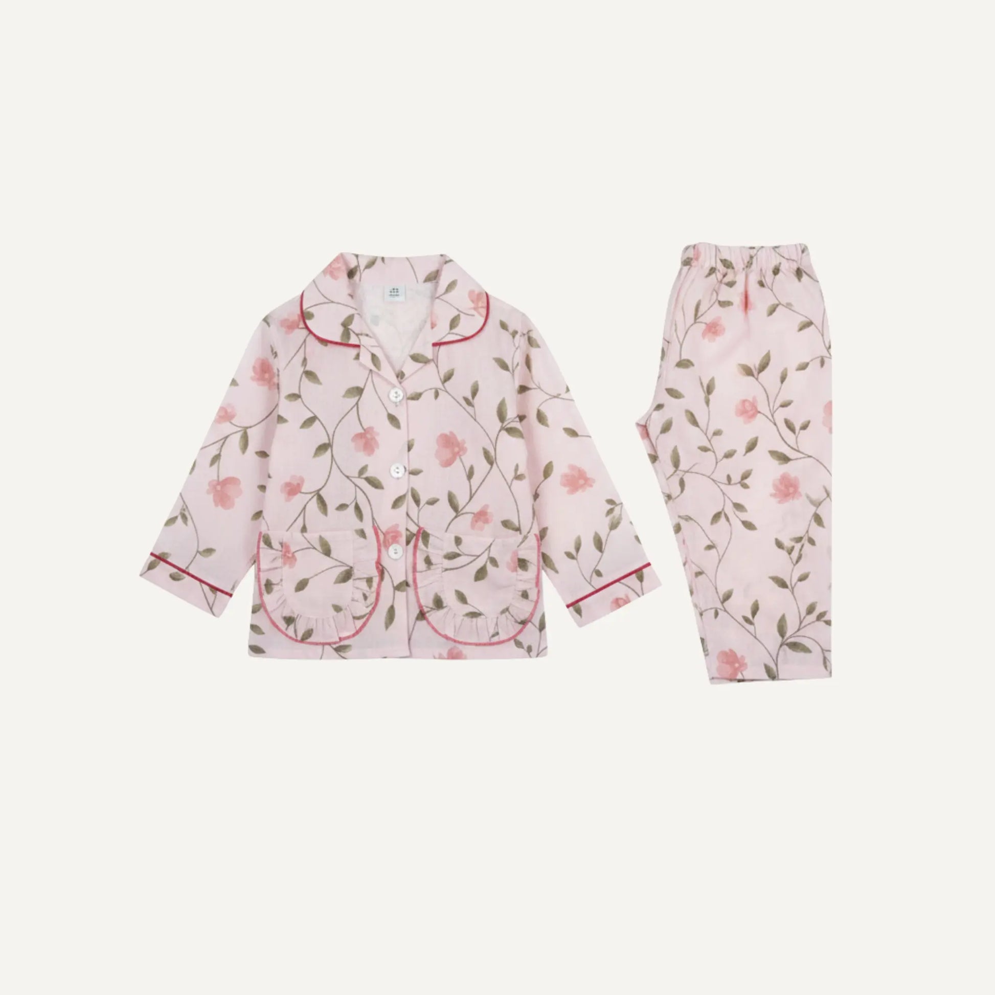 Let your little one drift off to a garden of dreams with our exquisite Pink Floral Print Cotton Night Suit. This beautiful full-sleeve, full-length pajama set is crafted from pure, soft cotton fabric, ensuring supreme comfort and breathability for your child's delicate skin.