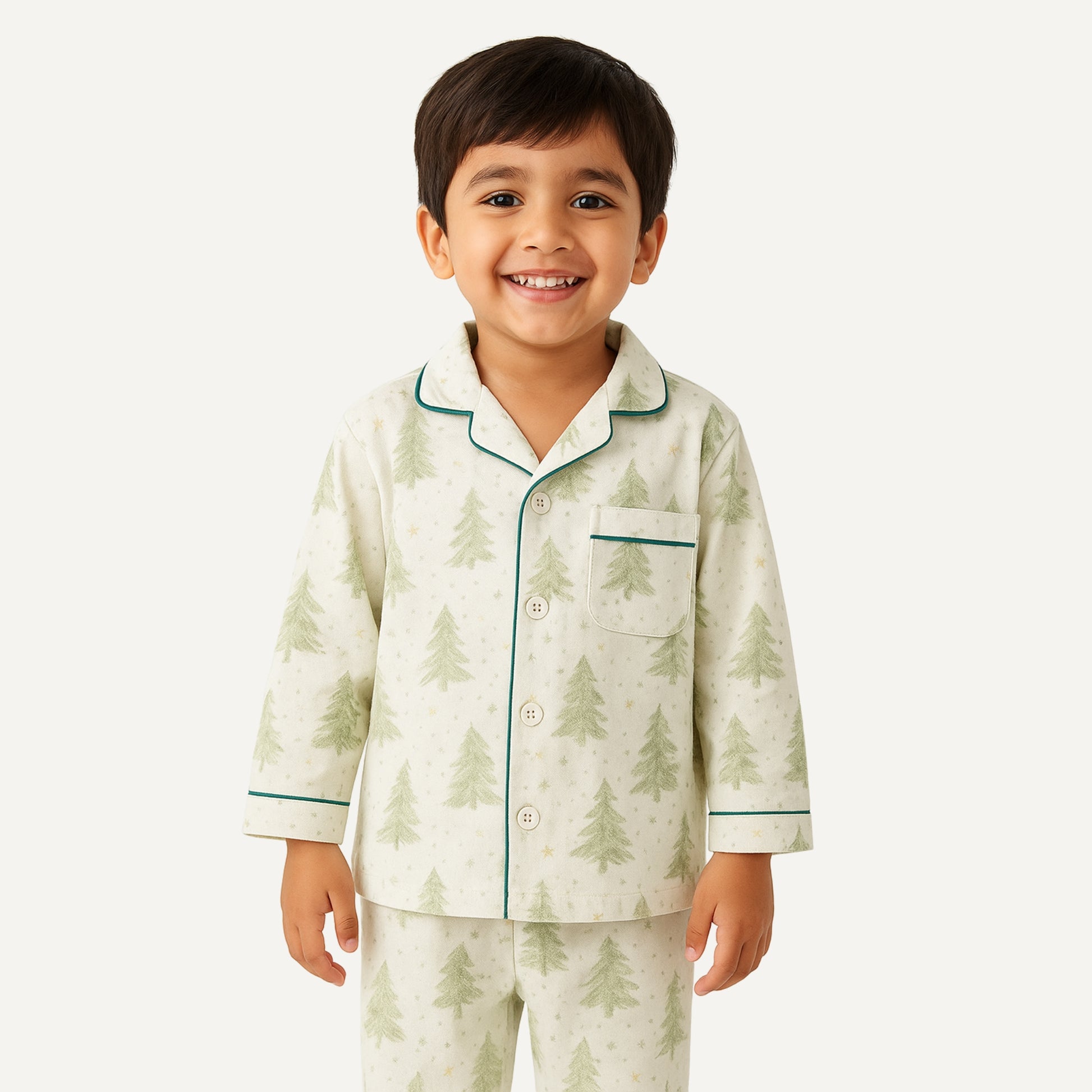 Kids Cotton Nightwear Pajama Set – White with Pine Tree Print