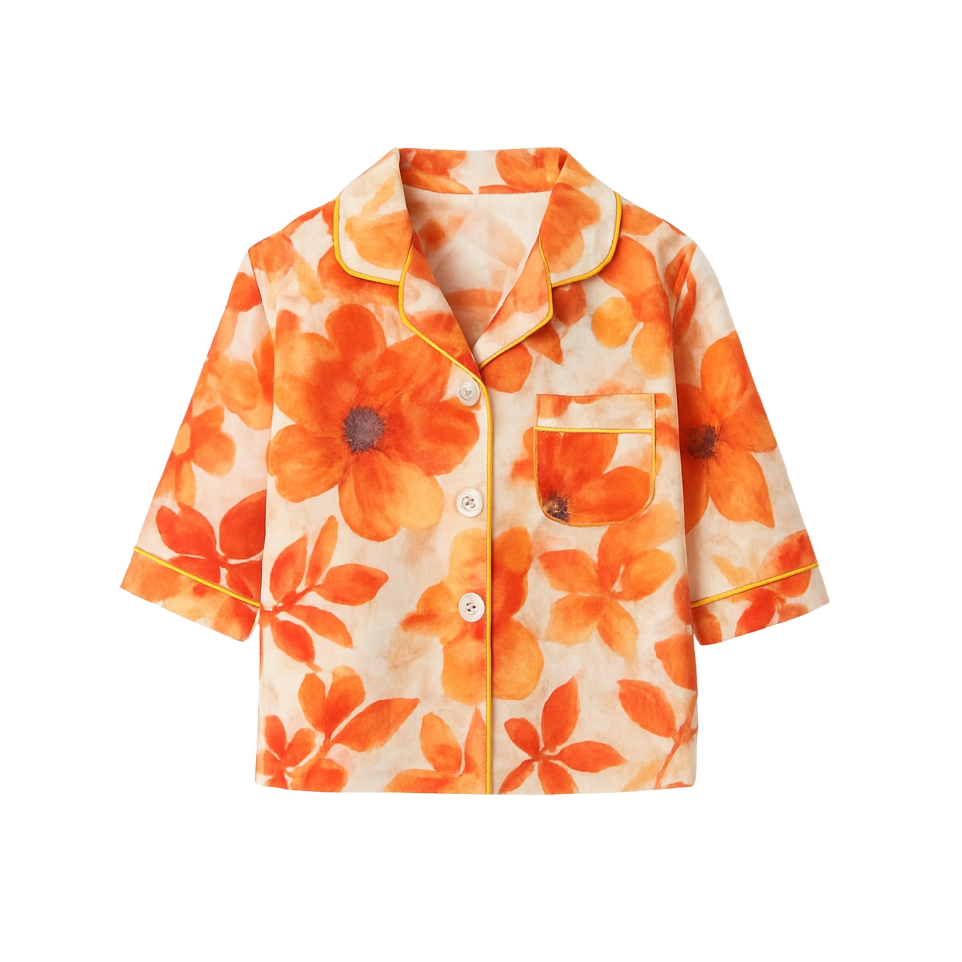 Design: Bright orange floral print with button-down shirt & chest pocket