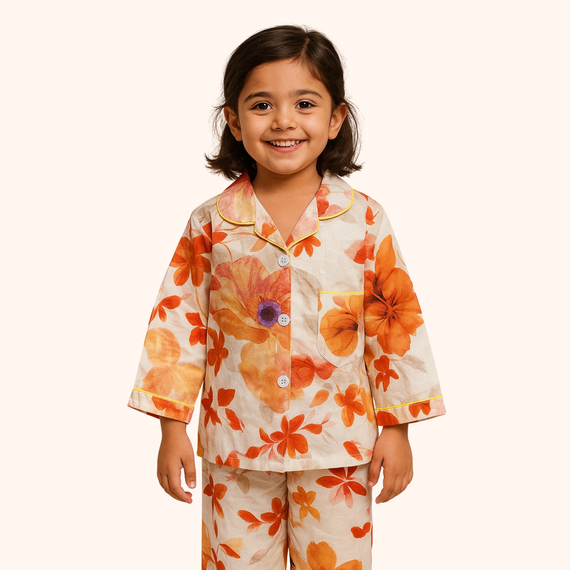 Add a splash of color to bedtime with our Kids Floral Cotton Pajama Set. Featuring a vibrant orange flower print with soft yellow piping, this pajama set is not only stylish but also ultra-comfortable. Made from lightweight, breathable cotton, it’s perfect for warm nights and gentle on kids’ skin.