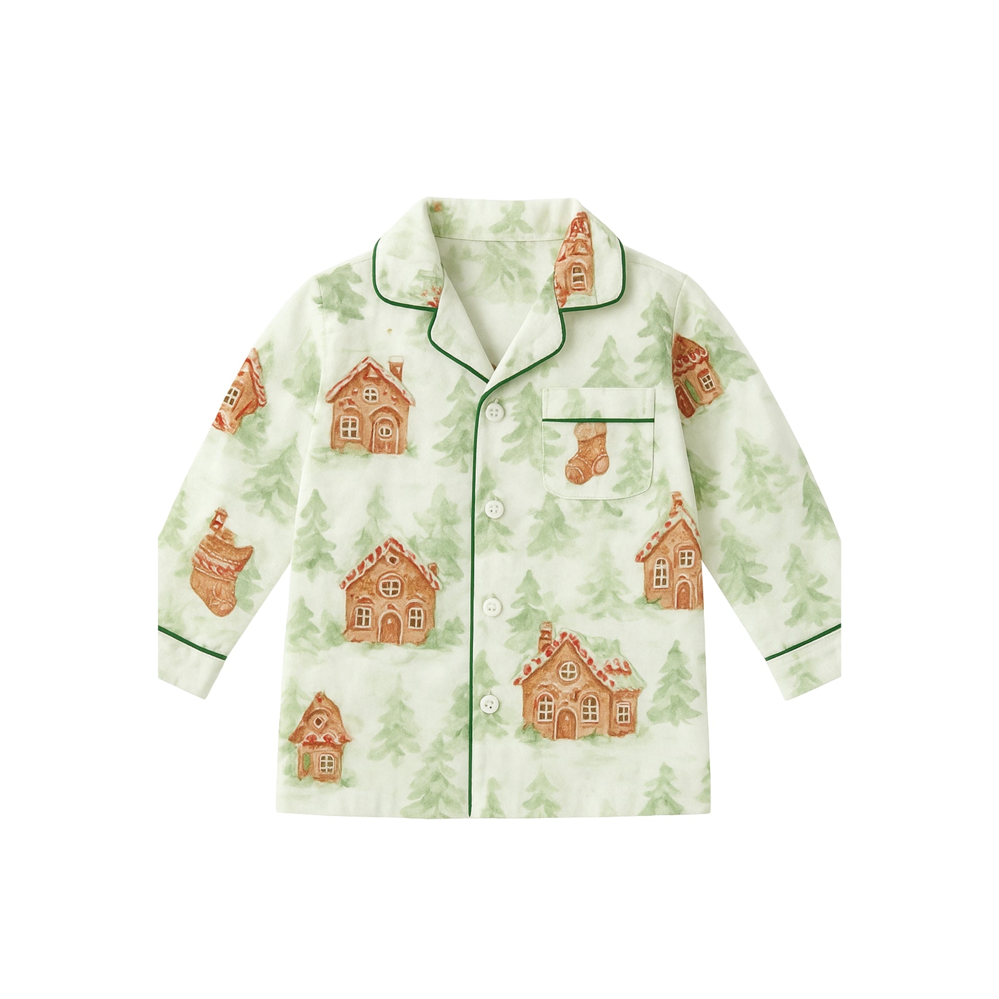 Make bedtime magical with our Kids Whimsical Cottage Pajama Set. Featuring cute gingerbread houses and pine trees on a soft cream base, this nightwear is perfect for the holiday season or year-round cozy nights. Crafted from soft, breathable cotton, it keeps kids comfortable and stylish.